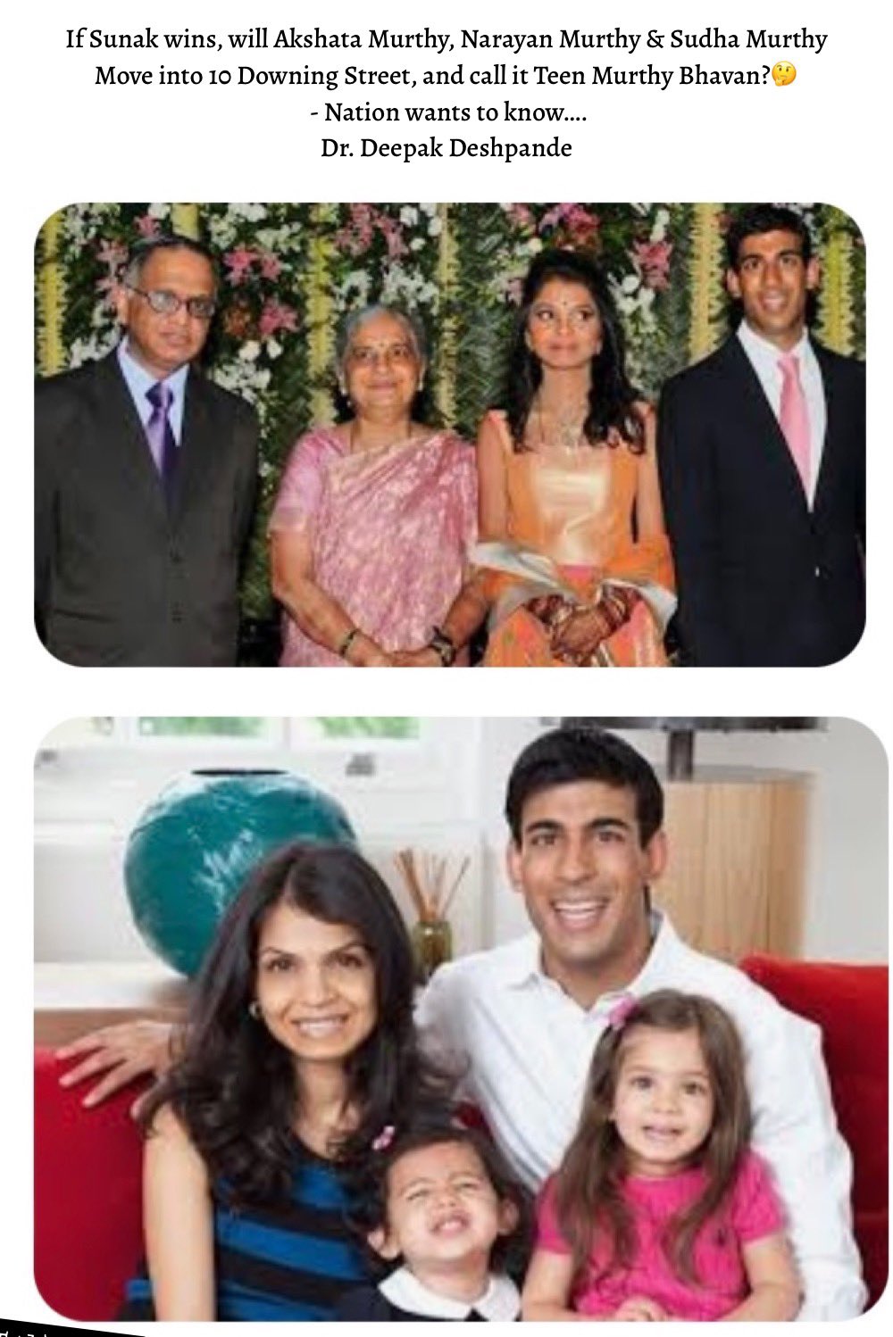 Dr Deepak Deshpande On Twitter If Sunak Wins Will Akshata Murthy Narayan Murthy Amp Sudha Murthy Move Into 10 Downing Street And Call It Teen Murthy Bhavan Nation Wants To Know